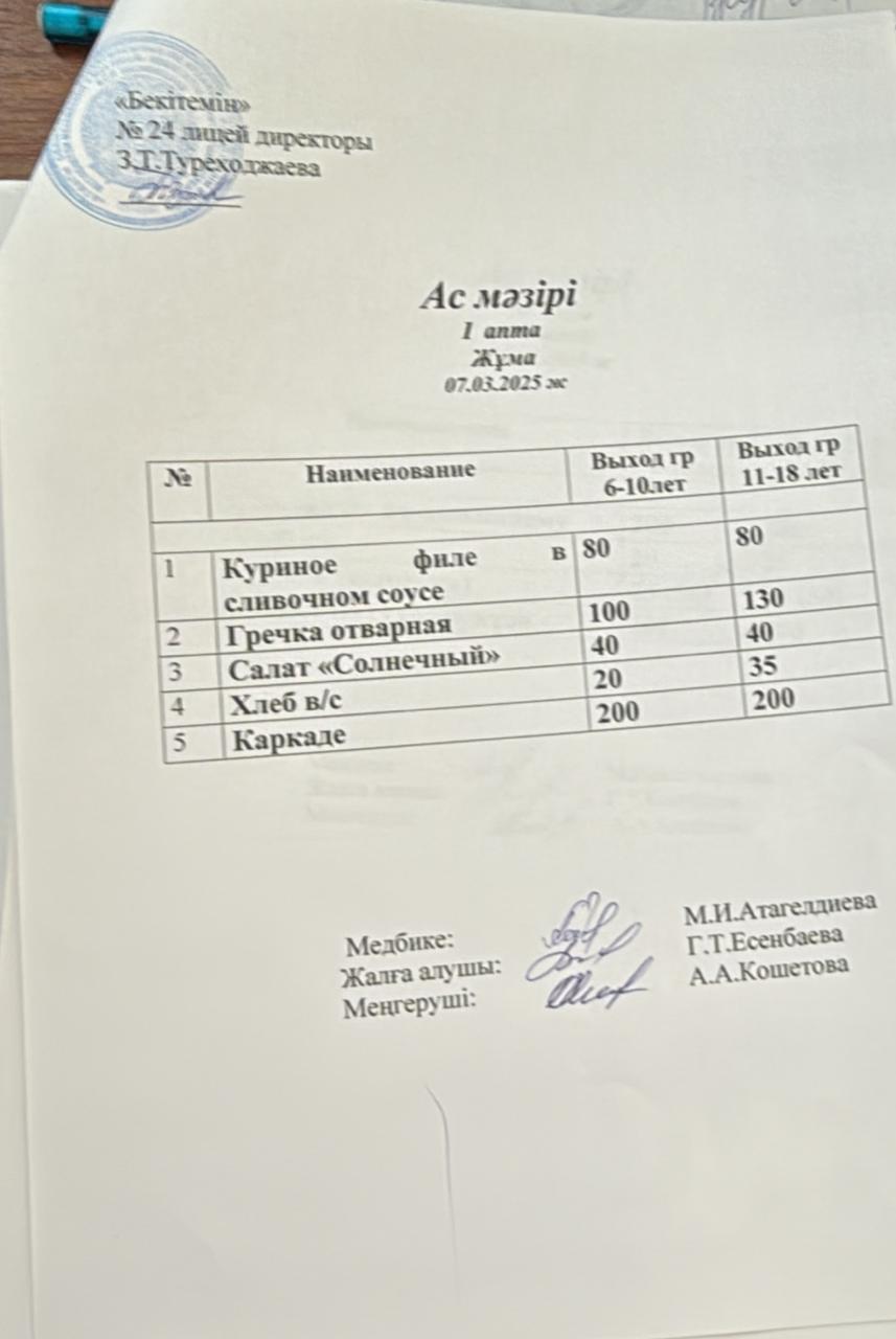 Күнделікті ас мәзірі » №24 ОРТА МЕКТЕП
