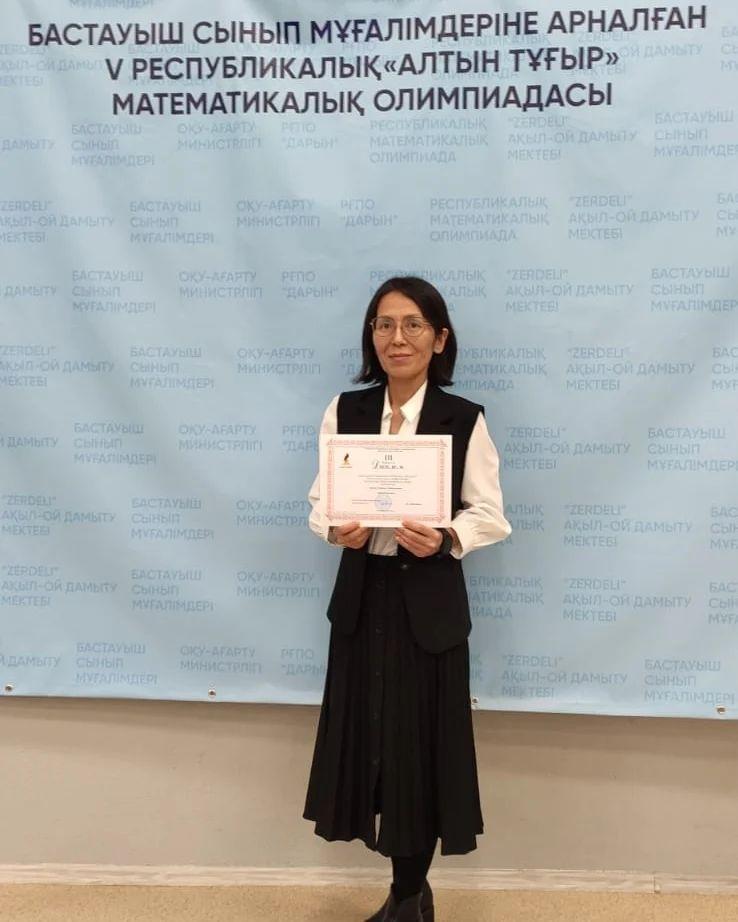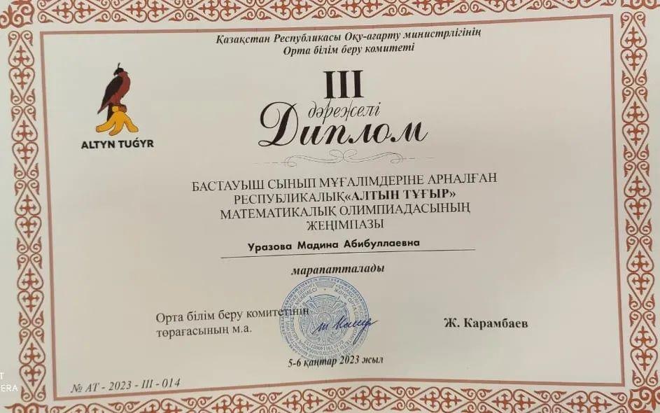5 қаңтар күні Астана қаласында "Zerdeli" ақыл- ой дамыту орталығының ұйымдастыруымен бастауыш сынып мұғалімдері арасында өткен V республикалық "Алтын Тұғыр" математикалық олимпиадасына әріптесіміз, облыстық кезеңнің жеңімпазы бастауыш сынып мұғалімі Уразова Мадина Абибуллақызы қатысып 3- орынды иеленді. 150 мұғалім қатысқан республикалық кезеңде топ жарып, жүлдегер атанған ұстазымызды құттықтаймыз! Жұмысыңызға табыс, еңбегіңізге жеміс тілейміз! Біз Сізді мақтан тұтамыз!