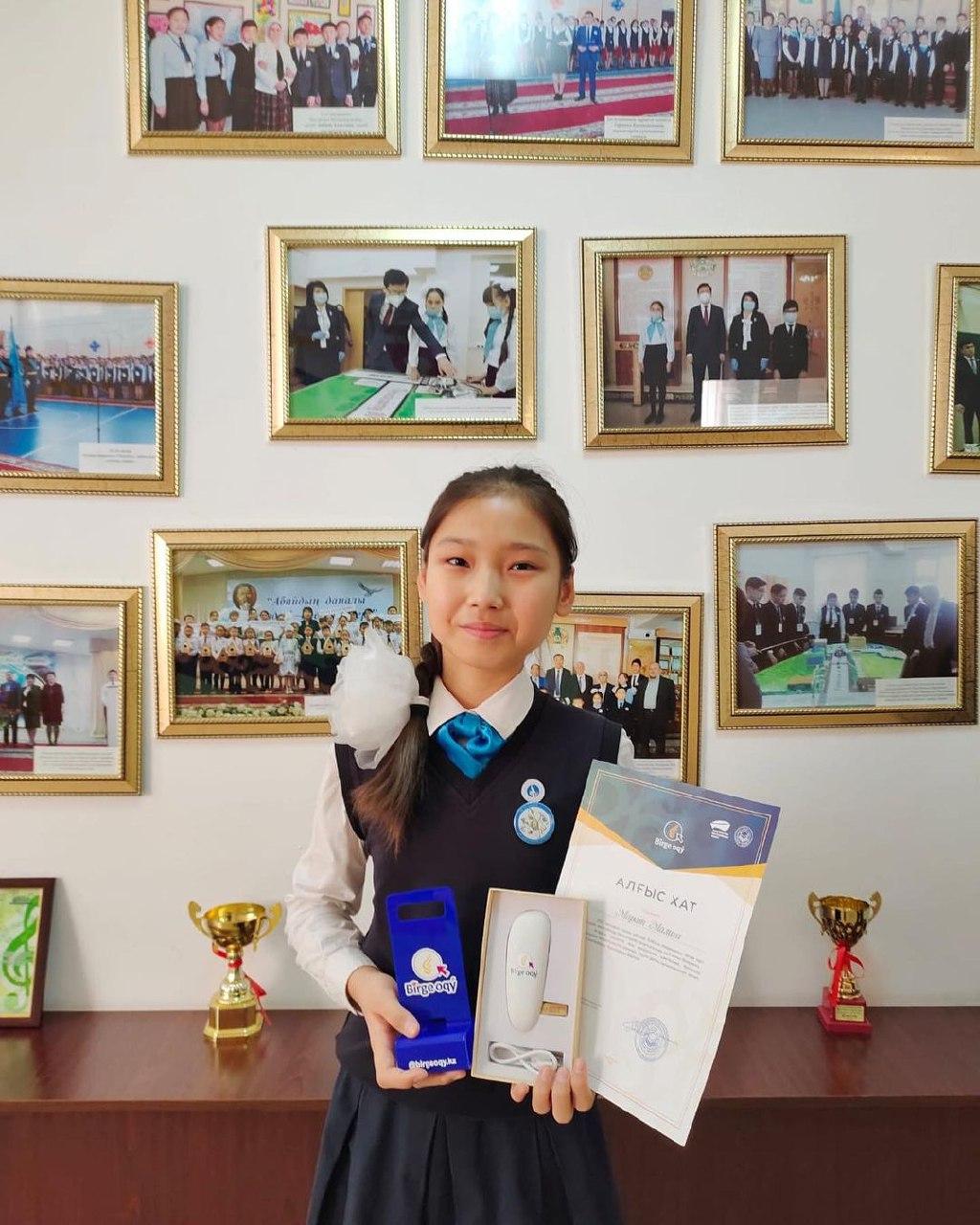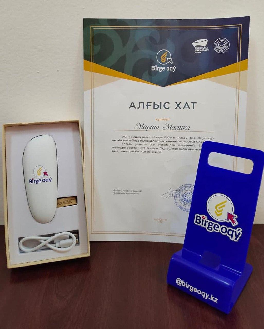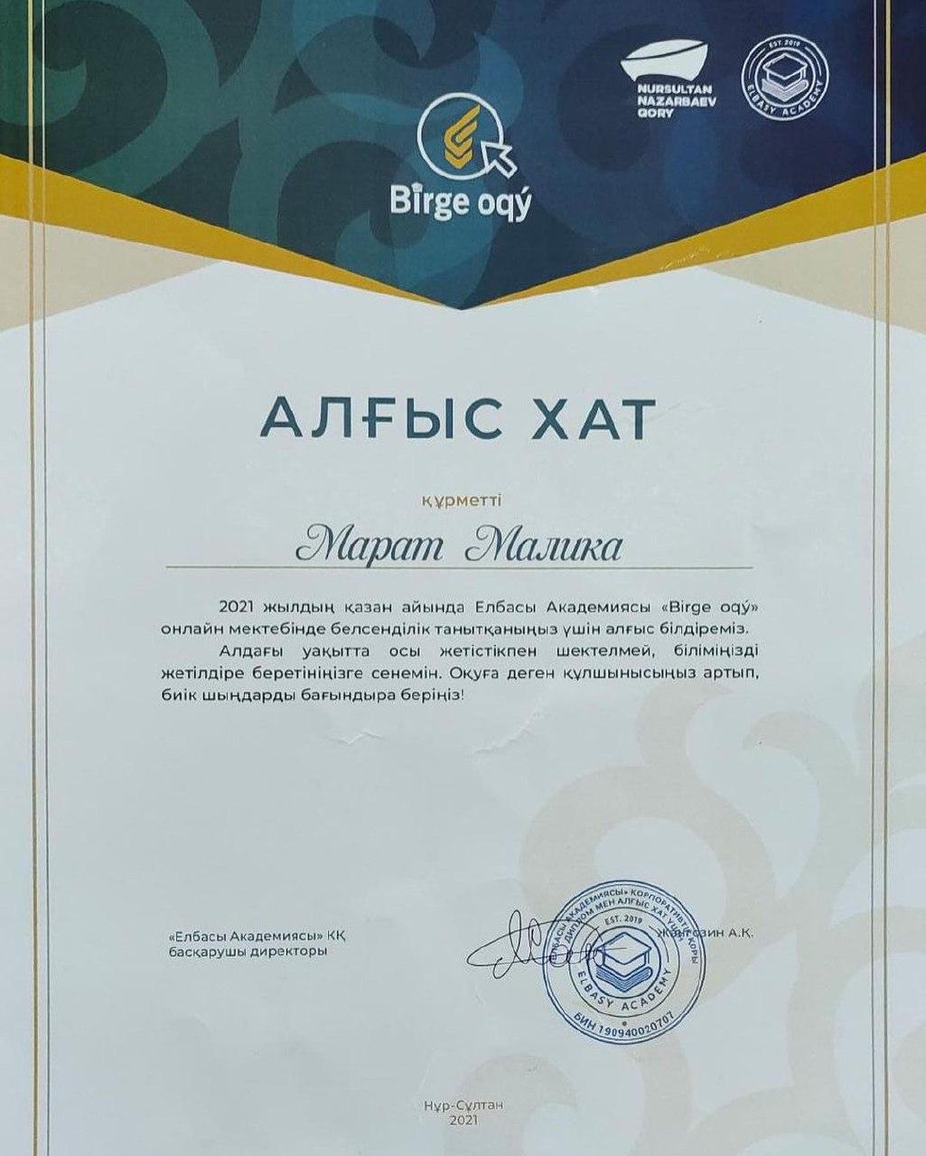2021 жылдың қазан айында Елбасы Академиясы "Birge oqy" онлайн мектебінде белсенділік танытқаны үшін №24 лицейдің 7д-сынып оқушысы Марат Малика Алғыс хат пен телефон қуаттаушы сыйлығына ие болды! Оқушымызды құттықтай отырып, оқуға деген құлшынысың арта берсін демекпіз!