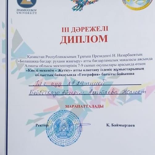 Бүгін Талдықорған қаласы І.Жансүгіров атындағы Жетісу Мемлекеттік Университетінде Қазақстан Республикасының Тұңғыш Президенті Н.Назарбаевтың "Болашаққа бағдар: рухани жаңғыру" бағдарламасы аясында Алматы облысы мектептерінің 7-9- сынып оқушылары арасында өткен "Киелі мекенім - Жетісу" тақырыбындағы өлкетану ізденіс жұмыстарының облыстық ғылыми жобалар байқауында "География" бағыты бойынша лицейіміздің 7- сынып оқушылары Бейбітқазы Айгерім мен Ақынтаева Жанет жүлделі ІІІ орынды иеленді. Жеңімпаз оқушыларымызды құттықтаймыз! 19.04.2019ж.