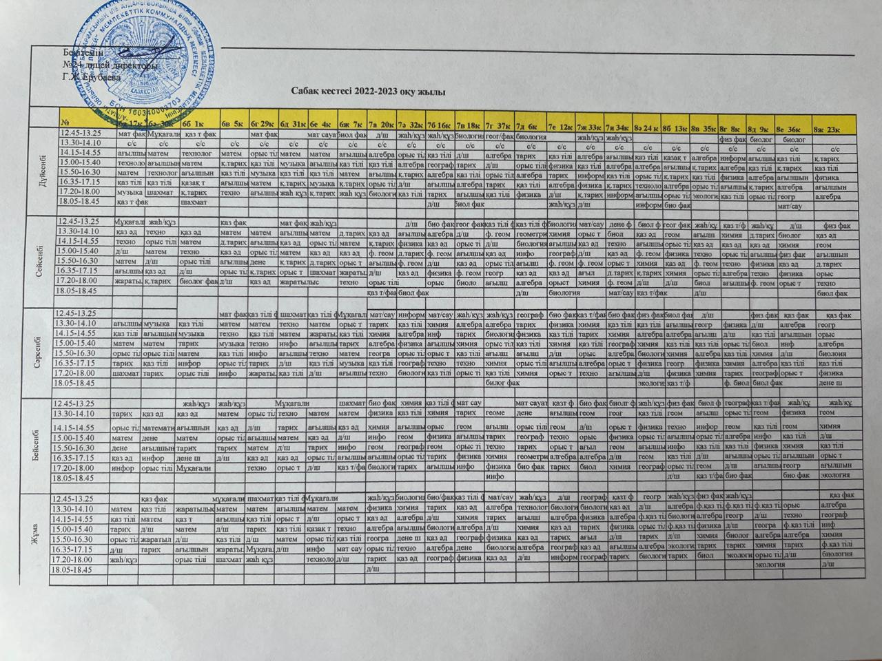 2022-2023 оқу жылындағы II ауысым сабақ кестесі