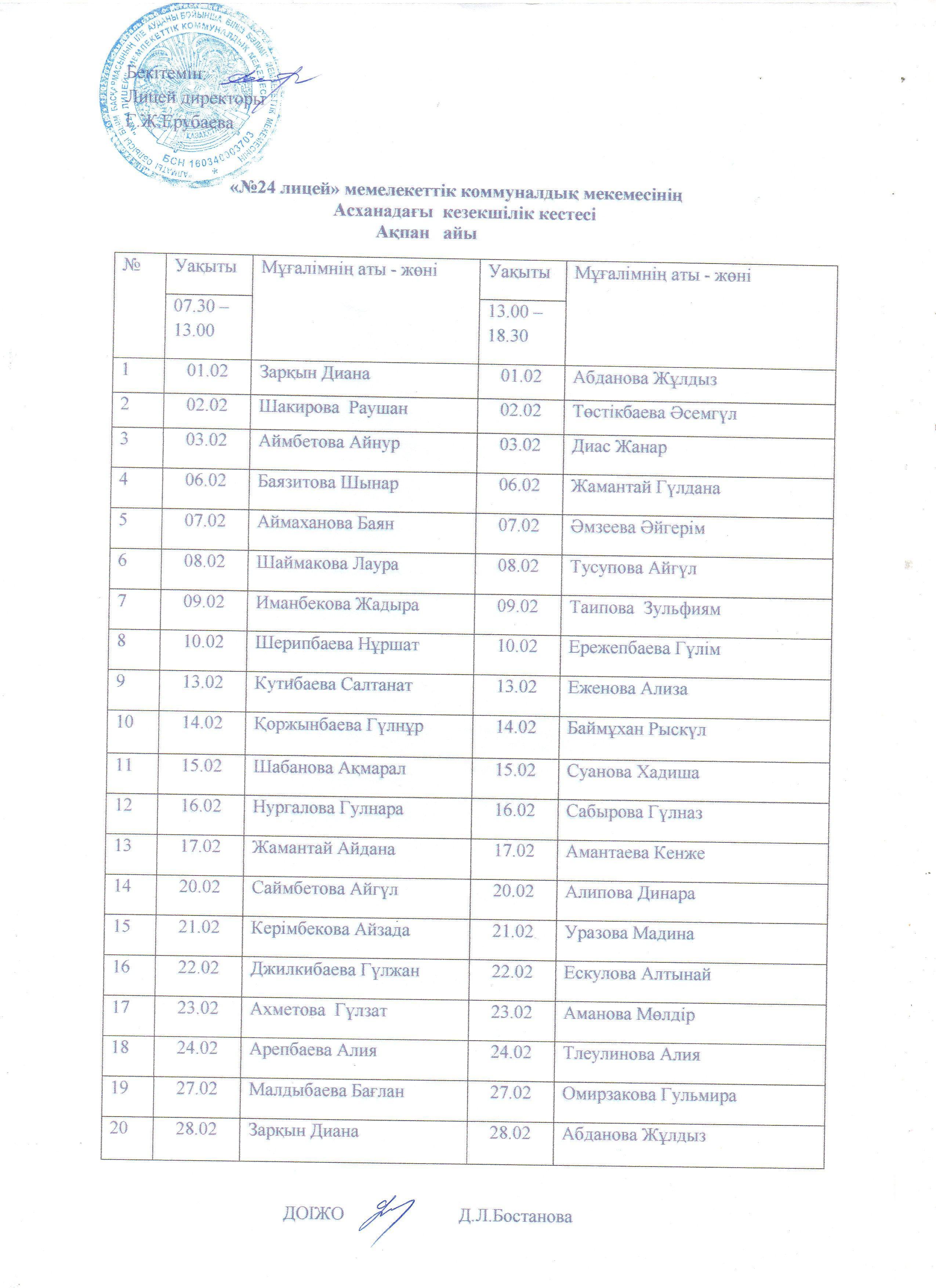 » » Асханадағы кезекшілік кестесі бойынша ақпан айы